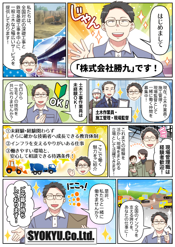 普段何気なく通っている道路や、生活に欠かせない電気・通信。私たち株式会社勝九は、それらを支える「基礎」をつくる建設会社です。 深礎工事や鉄塔基礎工事といった専門性の高い技術を強みに、北海道から沖縄まで全国各地の現場でインフラ整備に貢献しています。 「難しそう」「危険そう」と思われるかもしれません。しかし、当社には未経験からでも安心して成長できる手厚いサポートと、業界トップクラスの徹底した安全管理体制があります。 技術を身につけ、社会に貢献するやりがいを感じながら、私たちと一緒に「未来をつくる仕事」に挑戦しませんか?